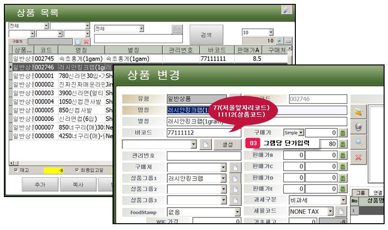 상품관리를 하는방법인데요 저울과 연동하여 매입과 판매를 병행하는 로직입니다.