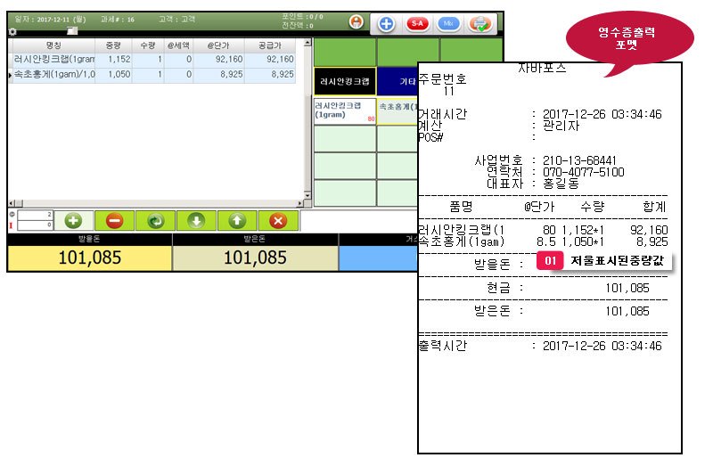 영수증과 판매화면 수산물시장, 청과 등 도매와 소매를 함께 병행하는경우, 판매처별 매입처별 외상